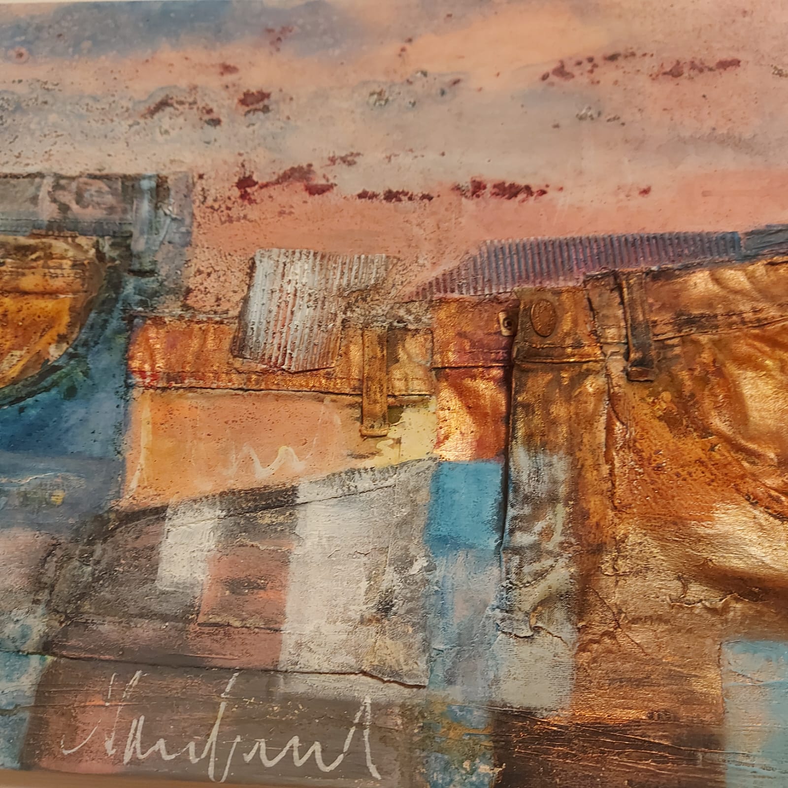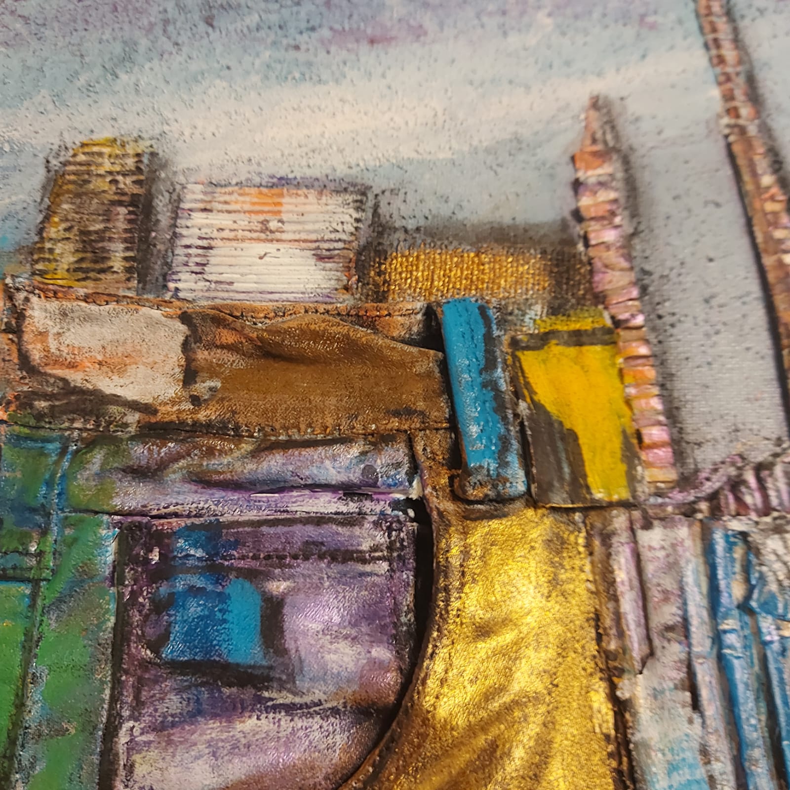 Aus recycelbaren Materialien, wie z.B. Jeans, Textilresten, Reißverschlüssen u.a. entstehen Collagen, die urban oder ganz abstrakt wirken können.